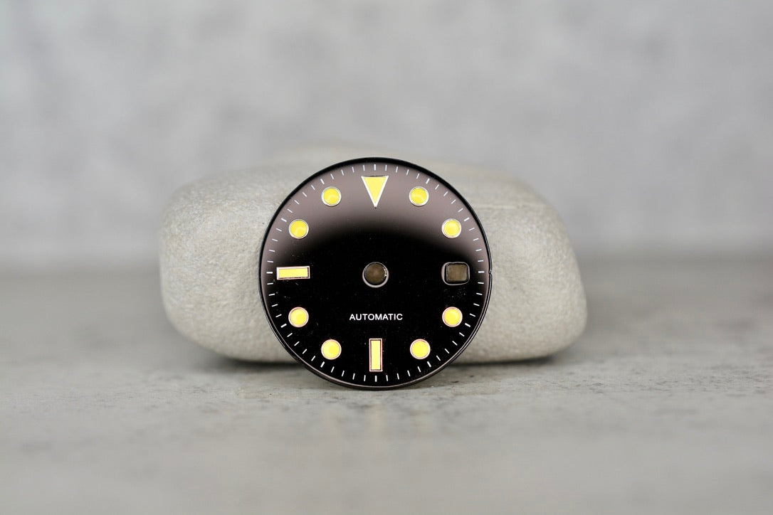 Polished Black Dial w. Faux Patina Lume Plots, 28.9mm
