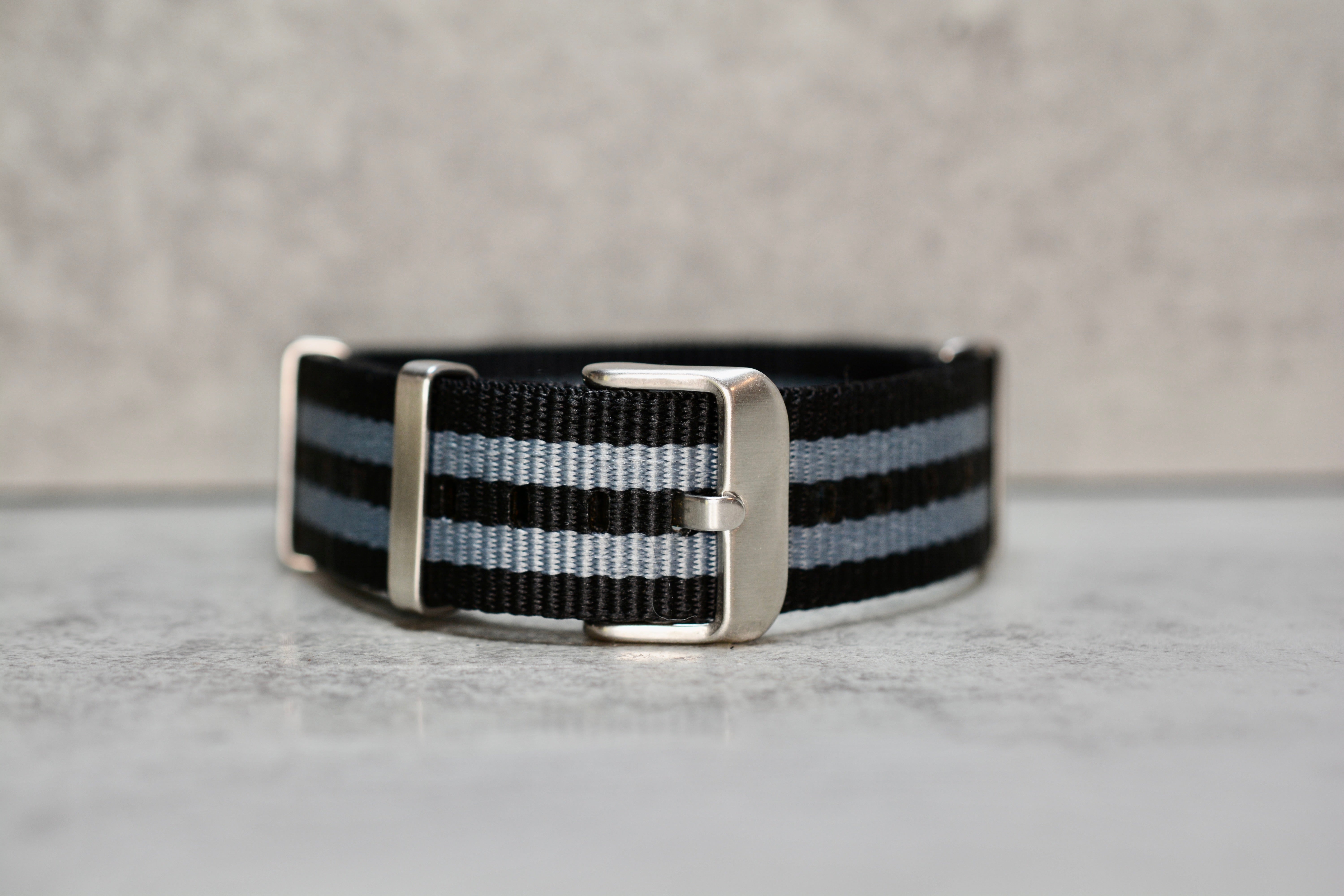 Black + Twin Grey Stripe Single Pass NATO Strap, 20mm - New
